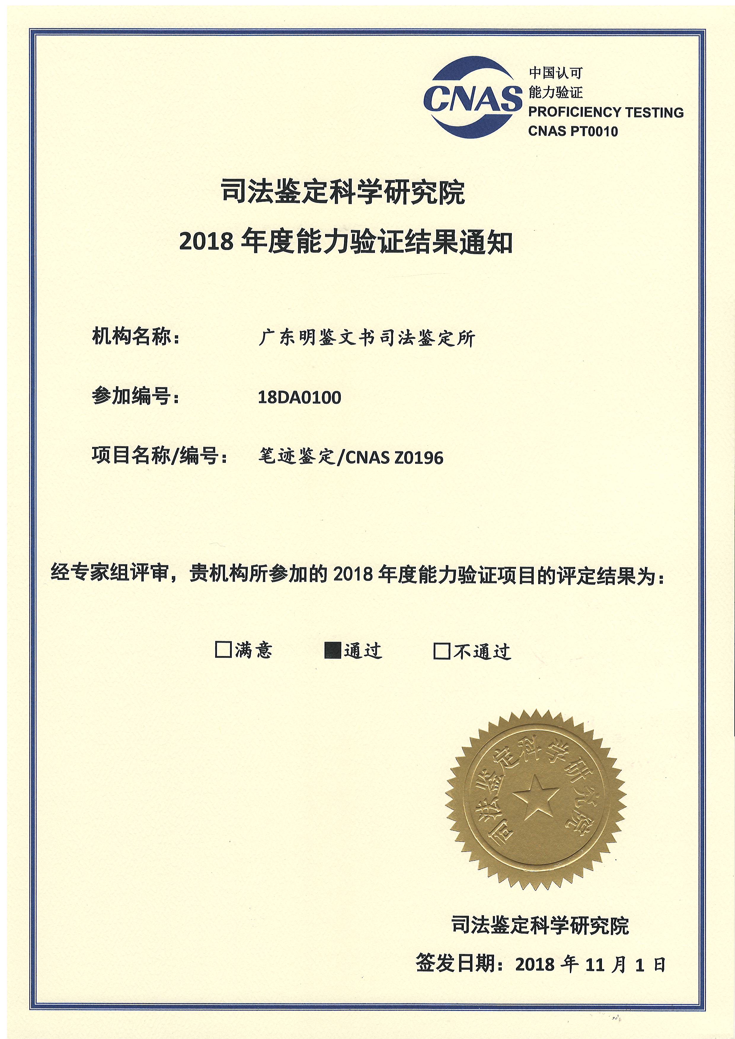 2018年能力验证结果通知(笔迹鉴定)